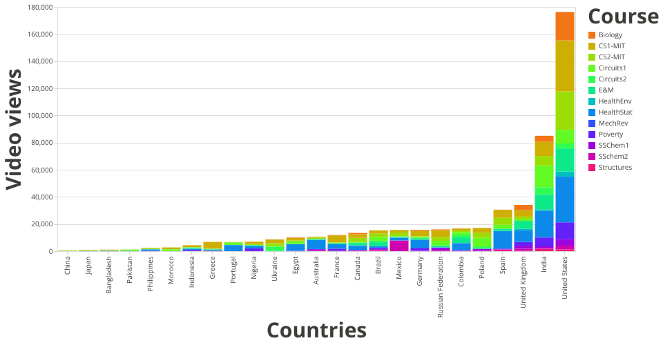 A visualization of video views according to HarvardX or MITX course on EdX for the 2013 academic year. These are the number of view counts per viewer. The color in the stacked bars reflect the courses that incurred the view events.