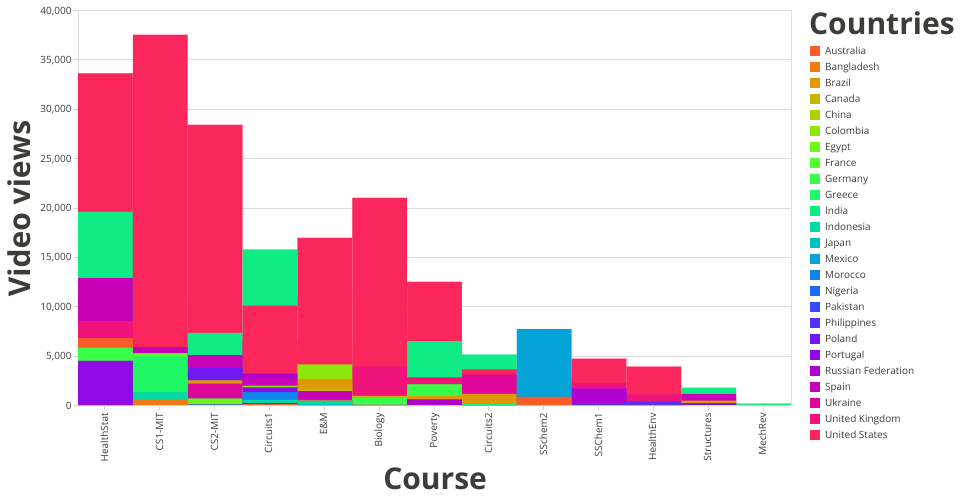 A visualization of video views according to HarvardX or MITX course on EdX for the 2013 academic year. These are the number of view counts per viewer. The color in the stacked bars reflect the courses that incurred the view events.