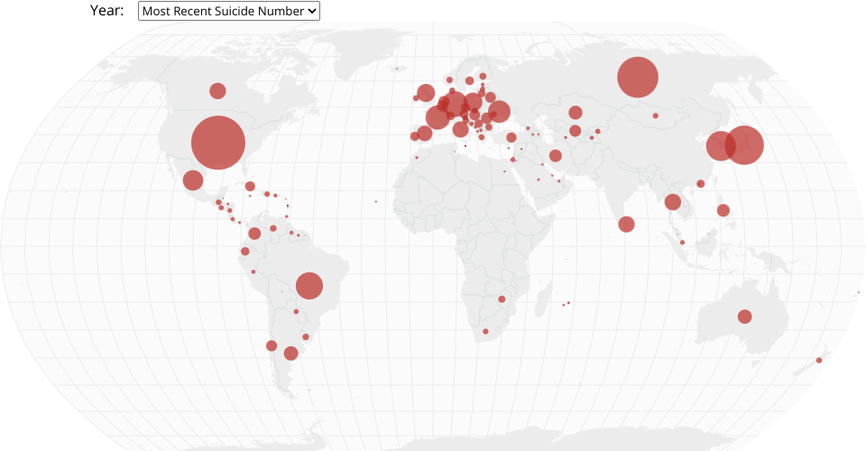 A world map showing suicide data provided by World Health Organization that has a drop down menu used to change the year.