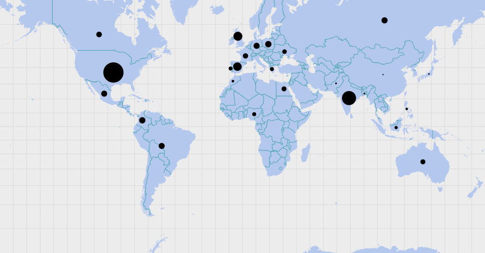 This is a visualization of the Harvardx/MITx Course-Person Dataset for the academic year 2013. The data shows the number of video views of the online courses, represented by the circles on the map. The data can be found here.