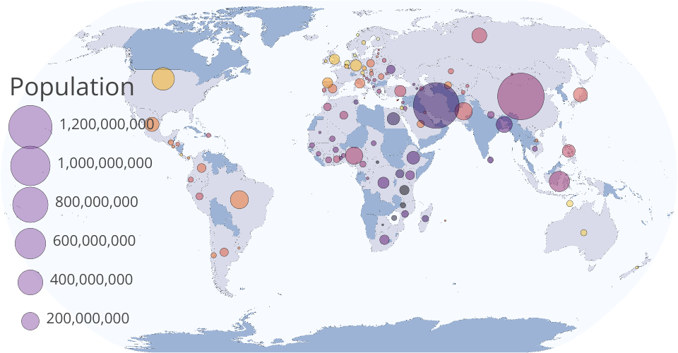Visualizing world happiness scores by population using colored circles representing different countries on a map.
