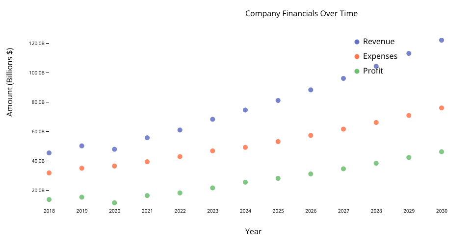 (Revenue, Expenses, and Profit) from 2018 to 2030 using a