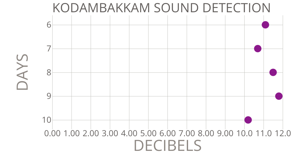 THIS SCATTER PLOT SHOWS DATA ABOUT SOUND DETECTION AT THE SITE OF KODAMBAKKAM AREA... WHICH ACTUALLY DEPICTS THAT THERE IS A HIGH LEVELS OF DECIBELS INFERRED..