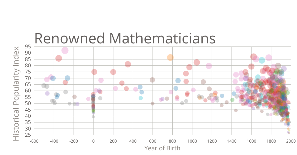 This scatterplot shows the most famous mathematicians based on two parameters - Historical Popularity Index, calculated by the creators of the dataset, and Wikipedia language editions. Data Source: Pantheon