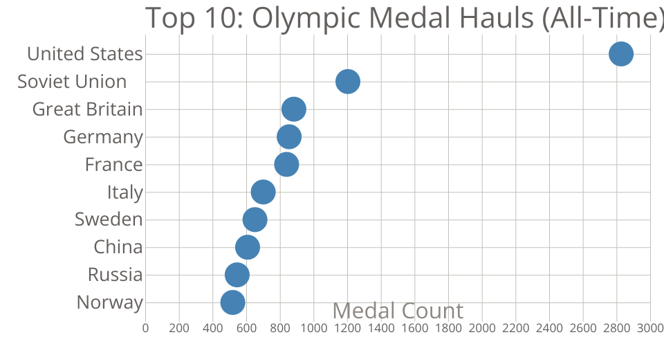 This bar chart shows the top 10 countries by medal count at the Olympics.