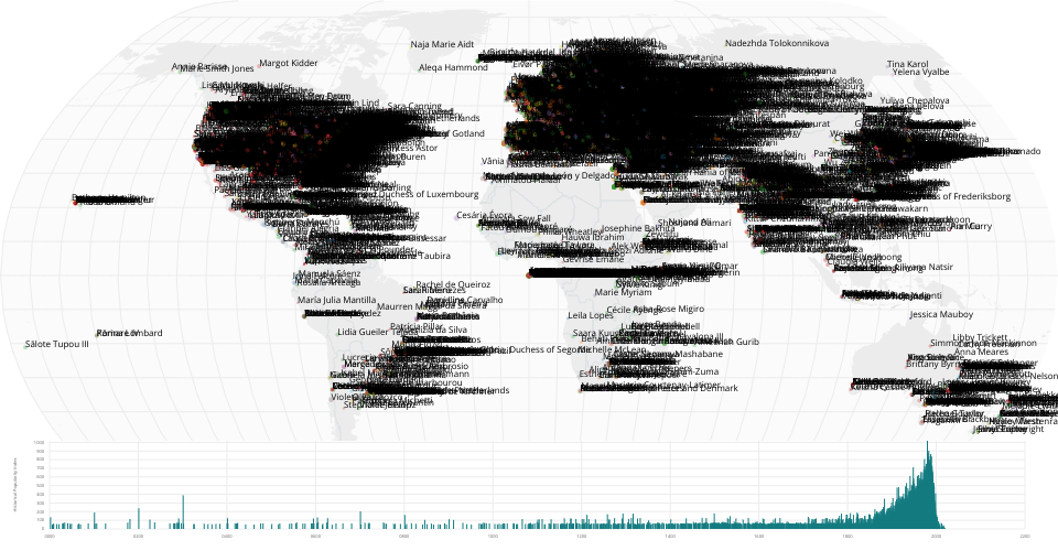 I plugged the Pantheon dataset into this dataviz template by Curran. There are 62875 people in this dataset. Entries that did not have a birth date were filtered from the original dataset.