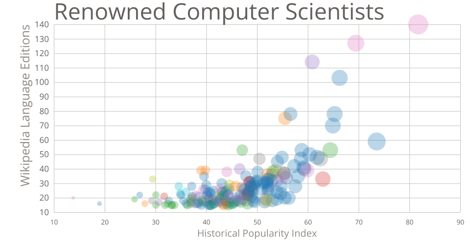 This scatterplot shows the most famous computer scientists based on two parameters - Historical Popularity Index, calculated by the creators of the dataset, and Wikipedia language editions. Data Source: Pantheon