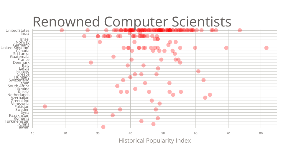 This scatterplot shows the most famous computer scientists based on two parameters - Historical Popularity Index, calculated by the creators of the dataset, and Wikipedia language editions. Data Source: Pantheon