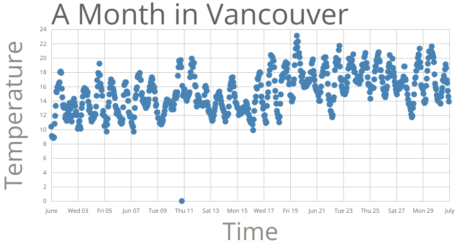This scatter plot shows one week of temperature at hourly intervals (in degrees Celcius) in Vancouver. Source: https://climate.weather.gc.ca/