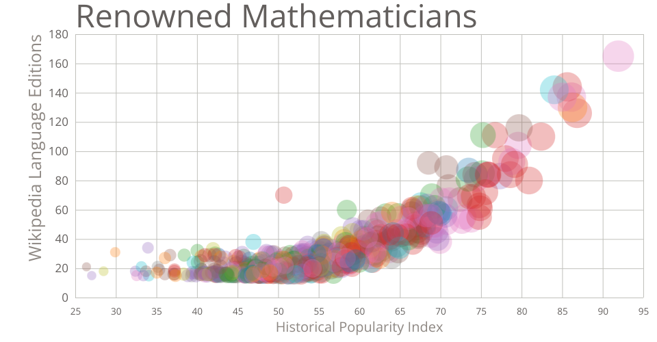 This scatterplot shows the most famous mathematicians based on two parameters - Historical Popularity Index, calculated by the creators of the dataset, and Wikipedia language editions. Data Source: Pantheon