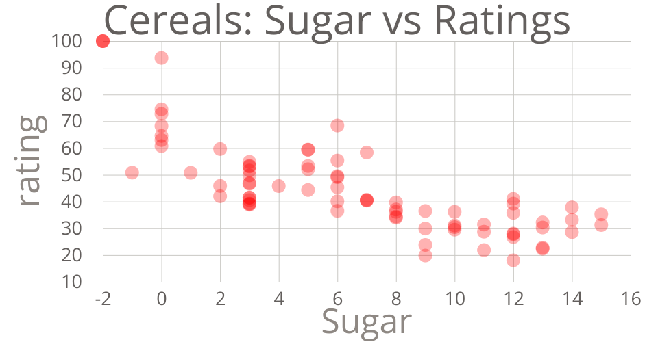 This plot gives the info on how cereals with sugar content (sugar being the most important ingredient to cut down for healthy diet) are rated. This scatter plot shows data about cereals, from https://perso.telecom-paristech.fr/eagan/class/igr204/datasets