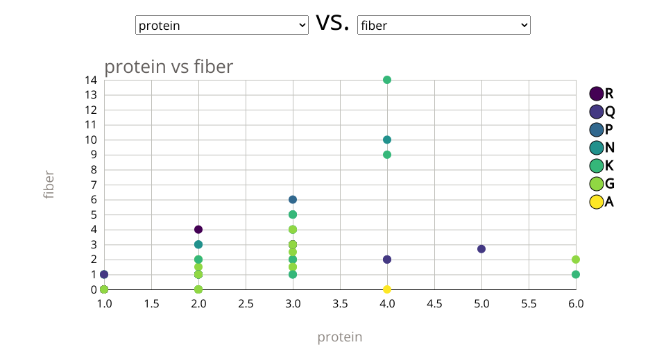 This plot gives the info on how cereals with sugar content (sugar being the most important ingredient to cut down for healthy diet) are rated. This scatter plot shows data about cereals, from https://perso.telecom-paristech.fr/eagan/class/igr204/datasets