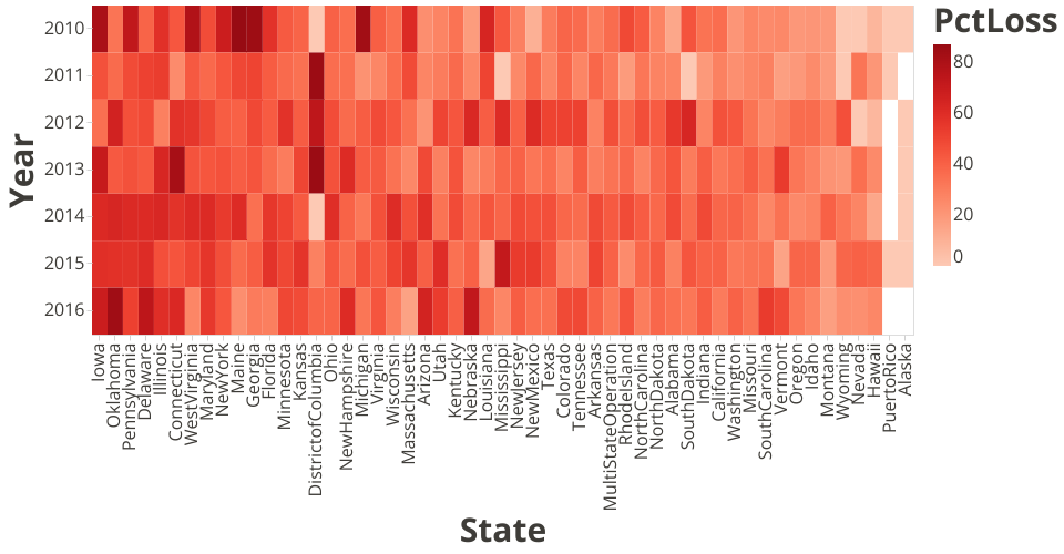 Each square represents the percentage loss of bee colonies in the state during the denoted year (when the census was taken).