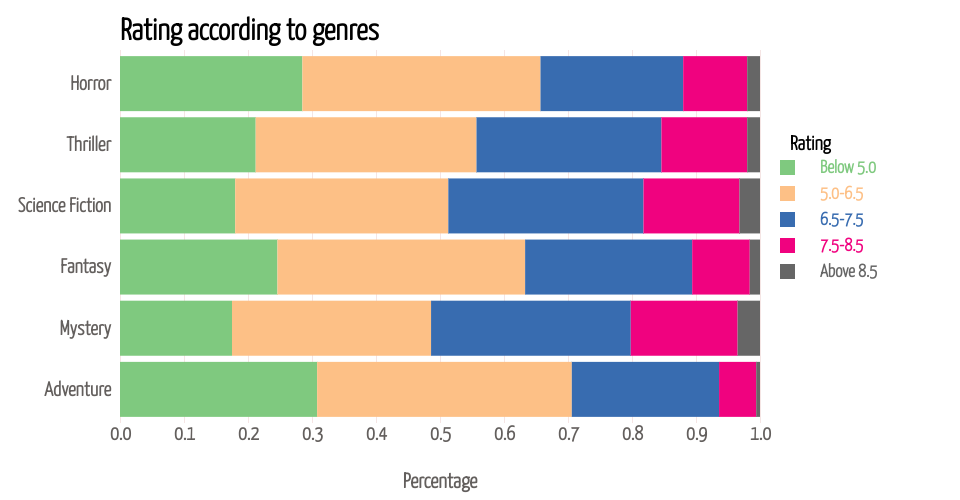 This stacked bar chart gives the percentage of each rating level within different movie genres. The aim is to show the impact of genre on movie ratings. When the mouse hovers over each bar, you can see pop-ups of accurate percentage of each rating level within each genre. Total percentage is 1, representing 100%.
