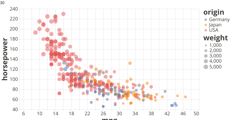 The data shown here comes from the UCI Machine Learning Repository: Auto MPG Data Set, via Gist: Scatter Plot with Menus.