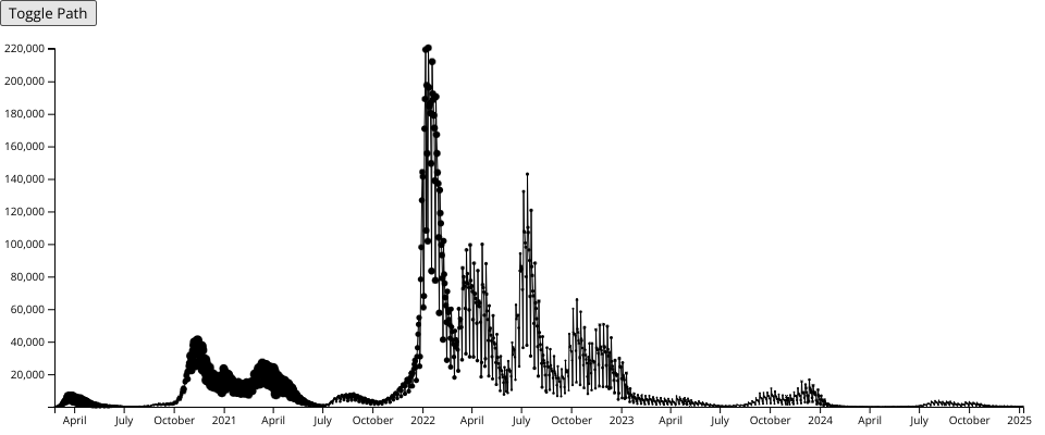 • the radius of points is proportional (i.e., scaleLinear) to the amount of patients in intensive care on a daily basis