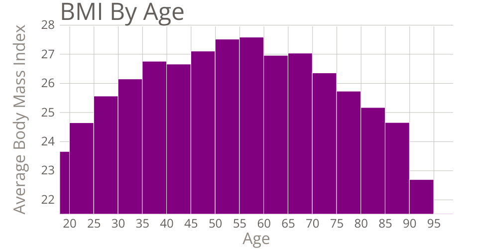 This visualization is a scatterplot of Body Mass Index by gender from the CDC Dataset.Body Mass Index is calculated using the following formula: [weight (lb) / height (in) / height (in)] x 703