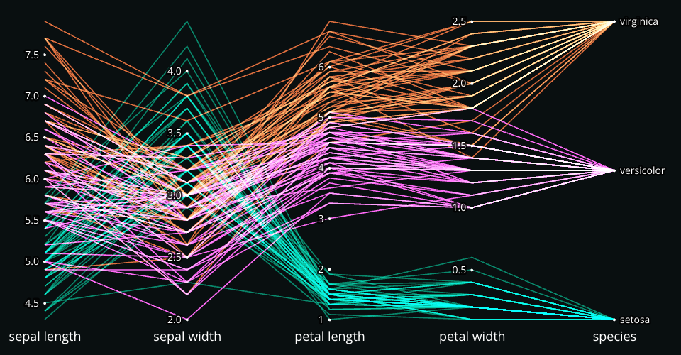 A parallel coordinates plot with brushing, multidimensional filtering, and responsiveness. Shows the Iris Dataset.