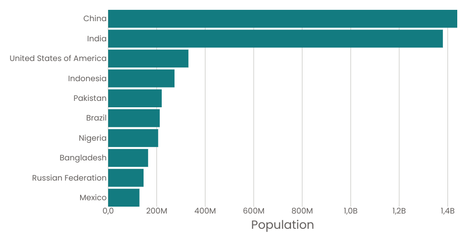 A program that shows the top 10 most populous countries as a pathetic bar chart with no axes.