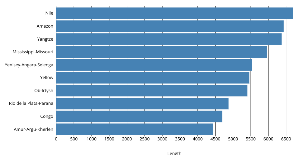 This bar chart shows the length of the 10 longest rivers in the world. Data is attributed to World Atlas.(https://www.worldatlas.com/articles/which-are-the-longest-rivers-in-the-world.html)