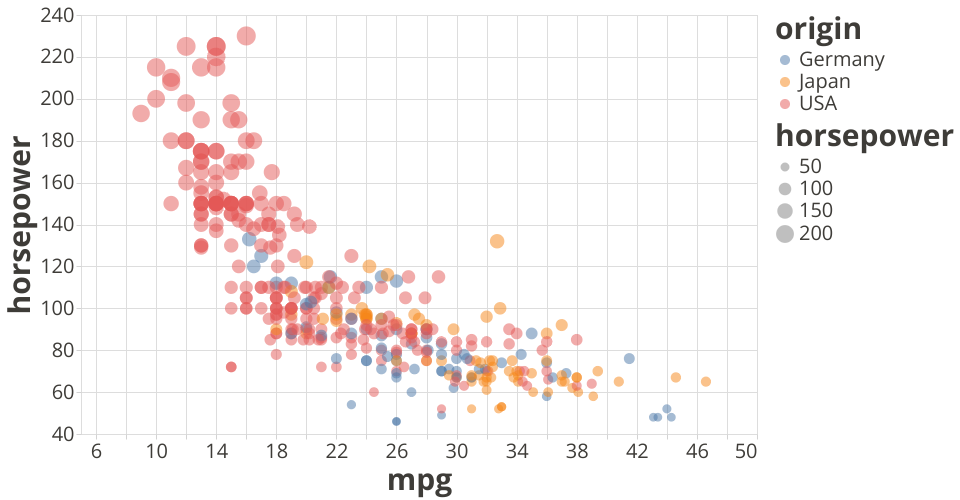 The data shown here comes from the UCI Machine Learning Repository: Auto MPG Data Set, via Gist: Scatter Plot with Menus.