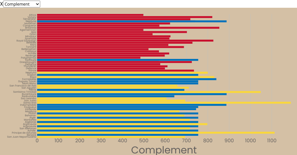 Ships of the line at the battle of trafalgar. Original table on wikipedia, I have edited the original data.