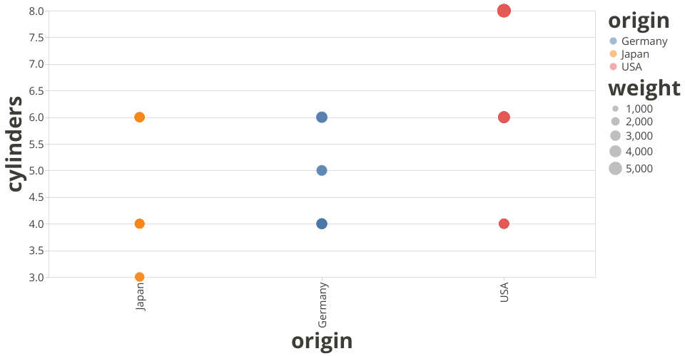 The data shown here comes from the UCI Machine Learning Repository: Auto MPG Data Set, via Gist: Scatter Plot with Menus.