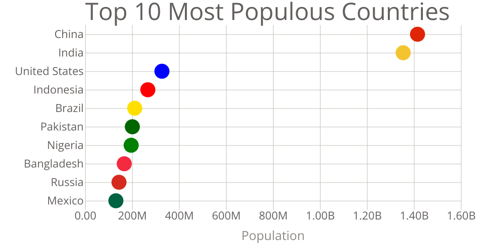 This bar chart shows population of the top 10 most populous countries. The data is sourced from 2018 estimate from the link: https://esa.un.org/unpd/wpp/download/standard/population/