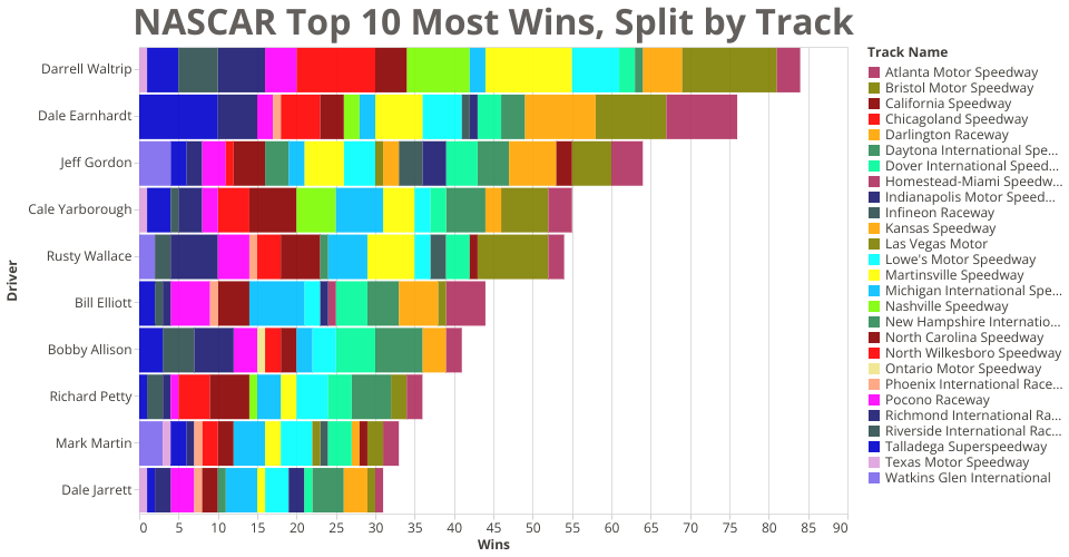 This bar chart displays the top 10 drivers in terms of wins in the dataset, with the bars broken down and colored by their wins at particular tracks. So, for example, the driver Darrell Waltrip leads drivers during this time period with 84 wins, and those wins are split by the tracks they occured at. A tooltip was added to display the track name, and the number of wins there. In order to display just the top 10, a variable was added to the dataset called "IsInTop10" and added to rows for those drivers. This data comes from a rendition of the NASCAR dataset, which spans from 1975 to 2003.