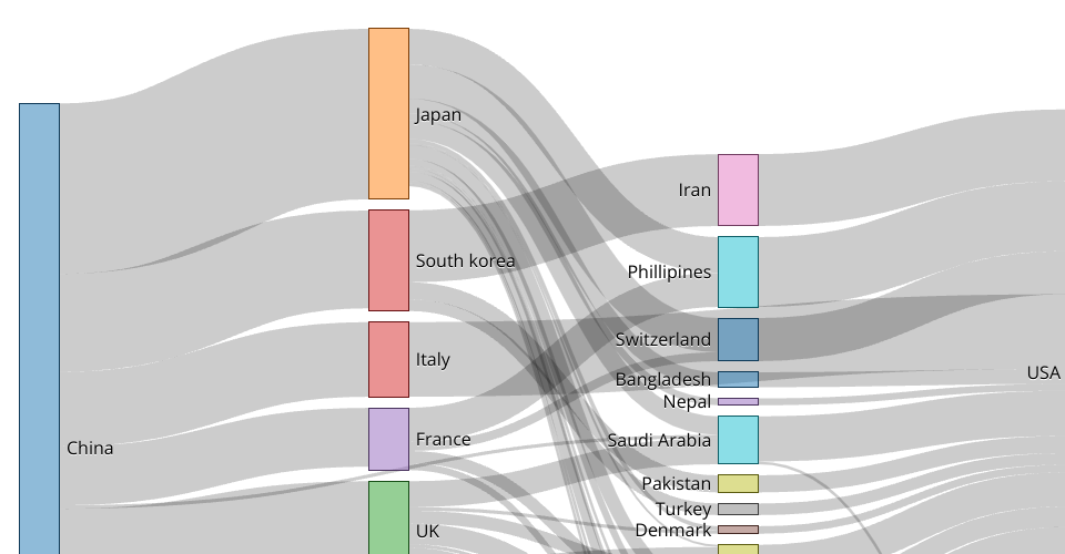 This visualisation was implemented to show the rate of spread between countries in the early stages of the outbreak. as we can see in the sankey diagram.