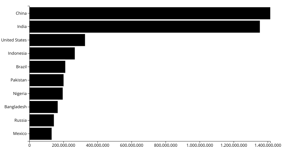 This bar chart shows population of the top 10 most populous countries. The data comes from the year 2018 estimate in United Nations: World Population Prospects 2017.