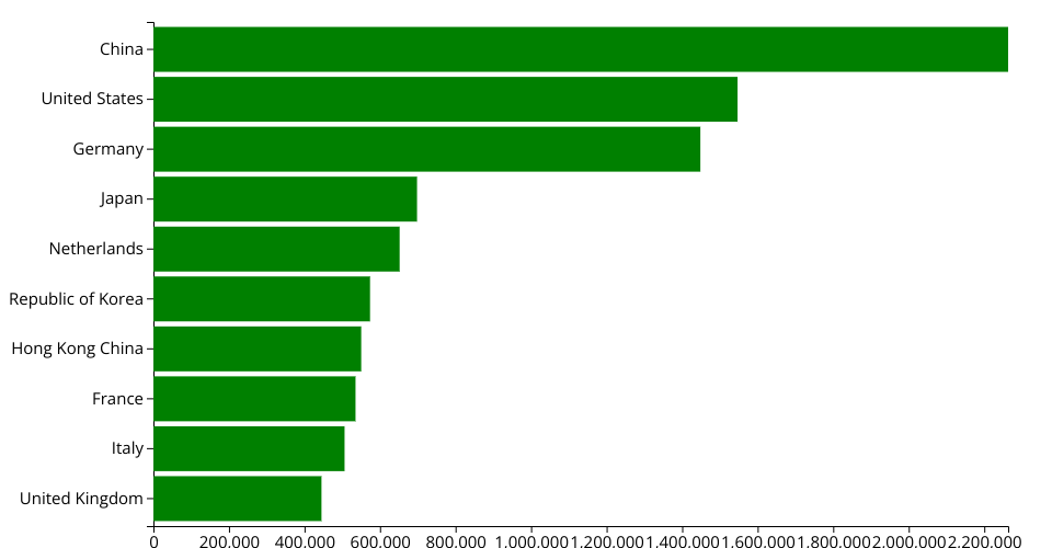 This bar chart shows the Top 10 total merchandise exports in US dollar at current prices (Millions) worldwise. The data comes from the year 2017 in World Trade Organization: Total Merchandise Export 2017.