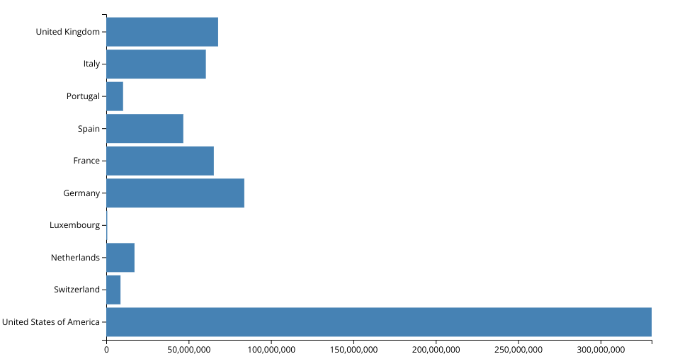 This bar chart shows population of the countries. The data comes from the year 2020 estimate in United Nations: World Popultion Prospects 2017.