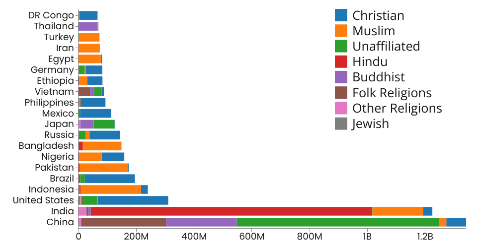 Estimated 2010 religion breakdown of the most populous 20 countries.