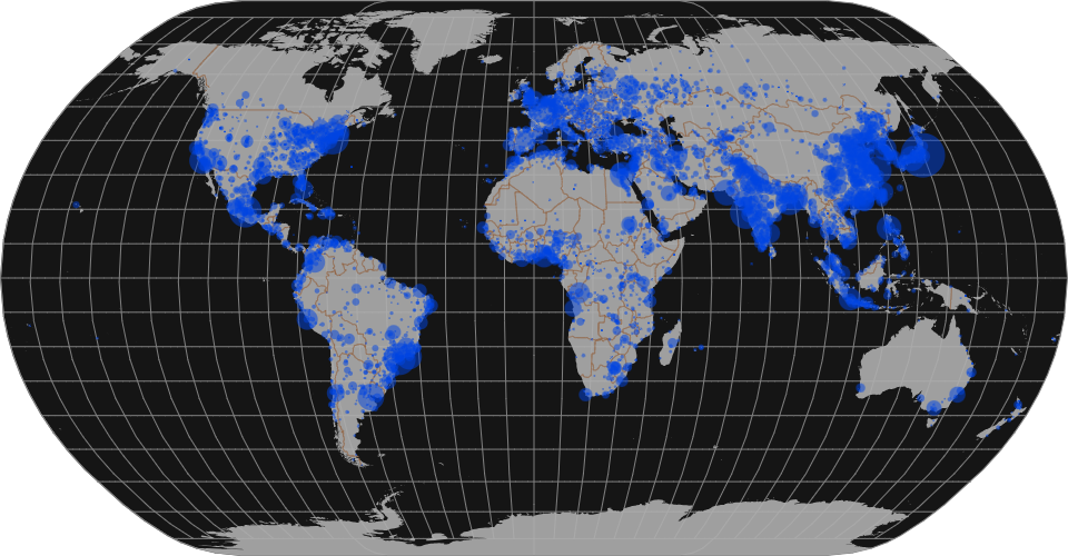 A world map showing cities with population greater than 50,000. City data from Simplemaps: World Cities Database.