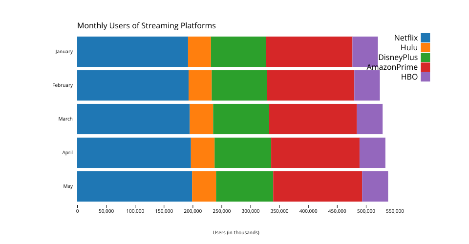 Each row represents a month, and the columns represent the number of users of each platform in that month (in thousands).