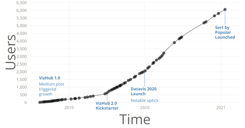 The number of VizHub users over time, since it was launched on August 14, 2018.