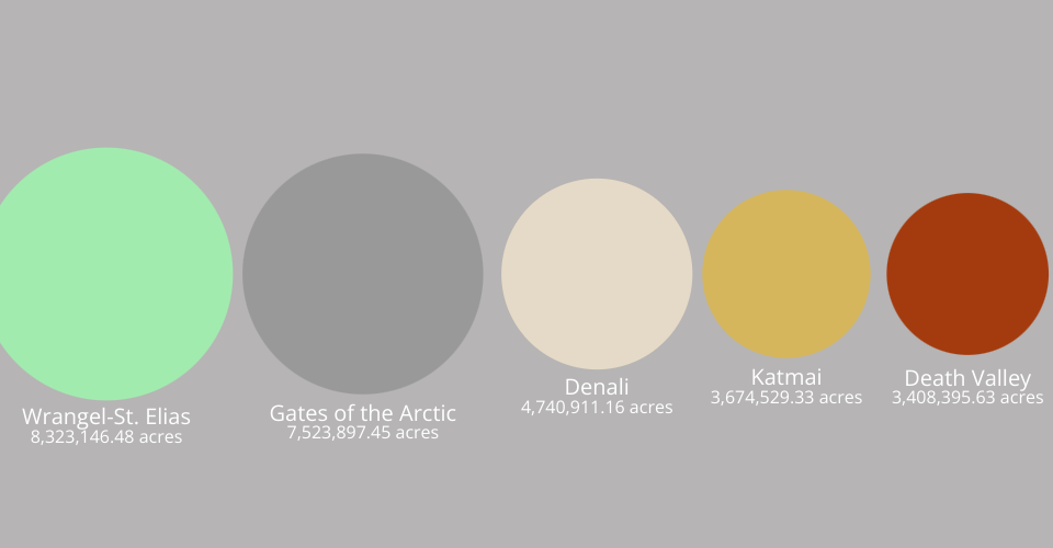 A visualization of the 5 largest US National Parks by land area (from first largest to 5th largest). Relative sizes to scale, distances not to scale. You will have to scroll down to the table (in Wikipedia) and click on the area header to filter by largest to smallest area.