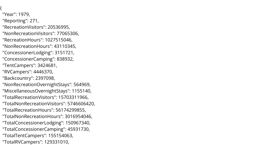 The National Park Service Annual Visitation Dataset, loaded and parsed as CSV. NOTE: You will have to select all years and all parks and click "generate report" to see the data.