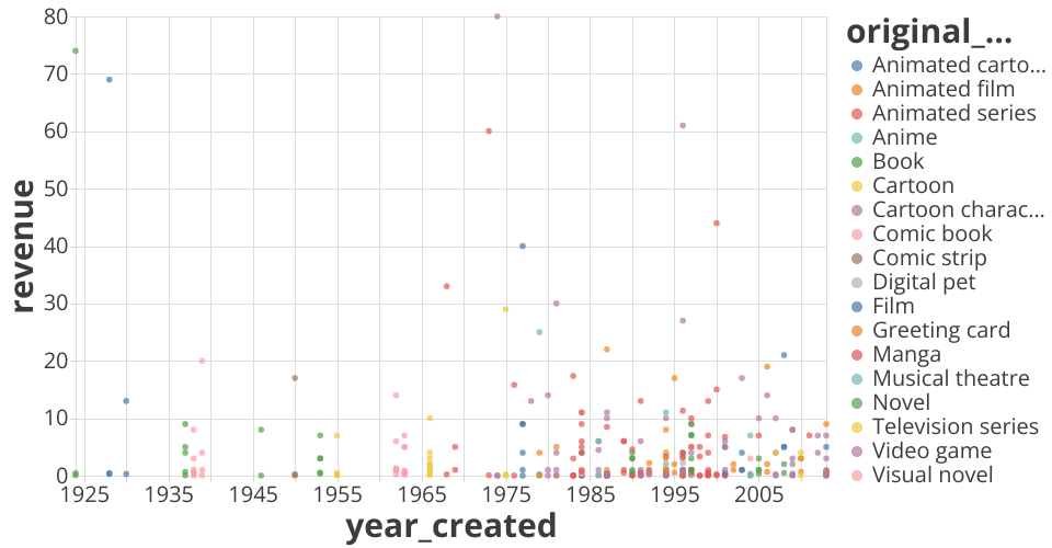 This chart shows Revenue Stream by Year Created. My goal was to see how revenue compares to the year the franchise was created, and the coloration shows the franchise's original media type to see if any obvious connections can be found. Each data point corresponds to a franchise's category. More identifying information is available by tooltip.