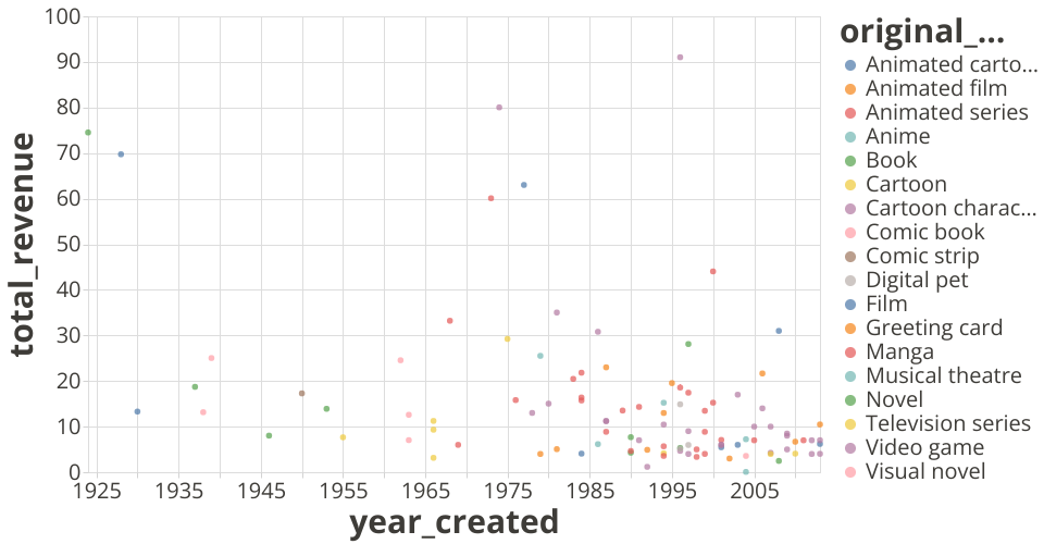 - Outliers are quite apparent. The oldest, most successful franchises (Mickey Mouse and Winnie the Pooh) are part of the trend, but the visualization makes it easy to see latecomers that lasted long enough to meet their success (Anpanman, Hello Kitty, and Star Wars) and the highest revenue-earning franchise which is impressively younger than all of these high-earners (Pokémon).