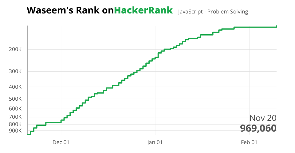 A visualization that tracks my ranking as I solve JavaScript algorithm problems on HackerRank... Just for fun!
