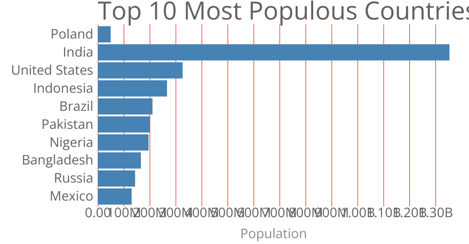 This bar chart shows population of the top 10 most populous countries. The data comes from the year 2018 estimate in United Nations: World Population Prospects 2017. It also demonstrates customization of D3 axes.