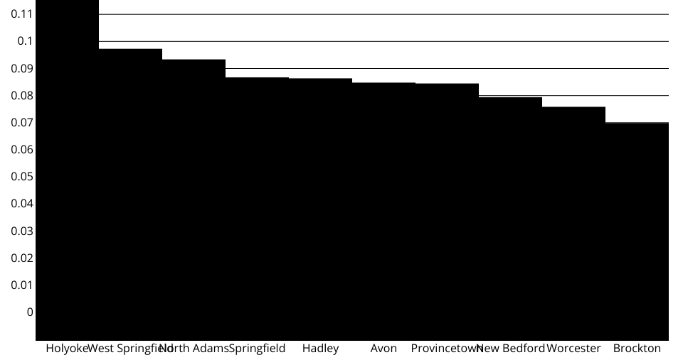 A program that shows the top 10 most crime city in massachusetts as a pathetic column chart with no axes.