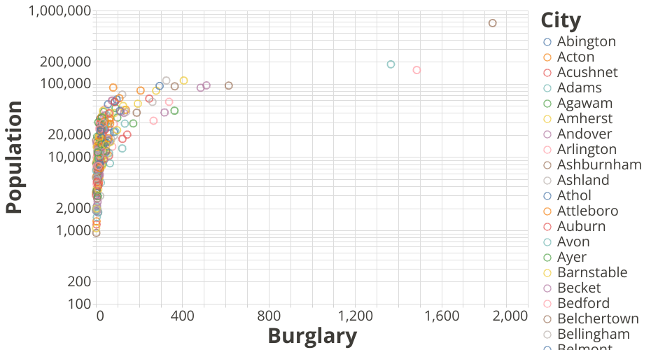 Crime dataset has been visualized. At similar range of population, New Bedford, fall river has higher Burglary crime