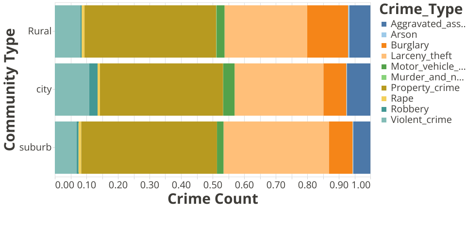Crime dataset is unpivot and reloaded in gist repository. This is used to visualize crime distribution in different community. Use 100% stack column chart. From the Chart, rural area have more Burglary, which city has more Robbery, Motor Viechil theft as well as violent crime