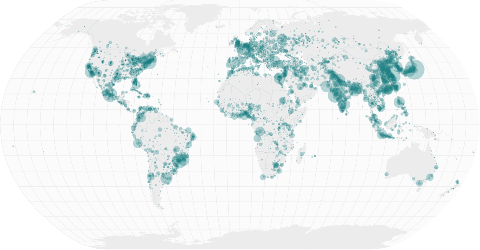 A world map showing cities with population greater than 50,000. City data from Simplemaps: World Cities Database.