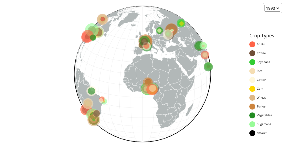 A globe with panning and zooming showing modified data from Climate change and Agriculture Dataset, and the Original Dataset can be found here.