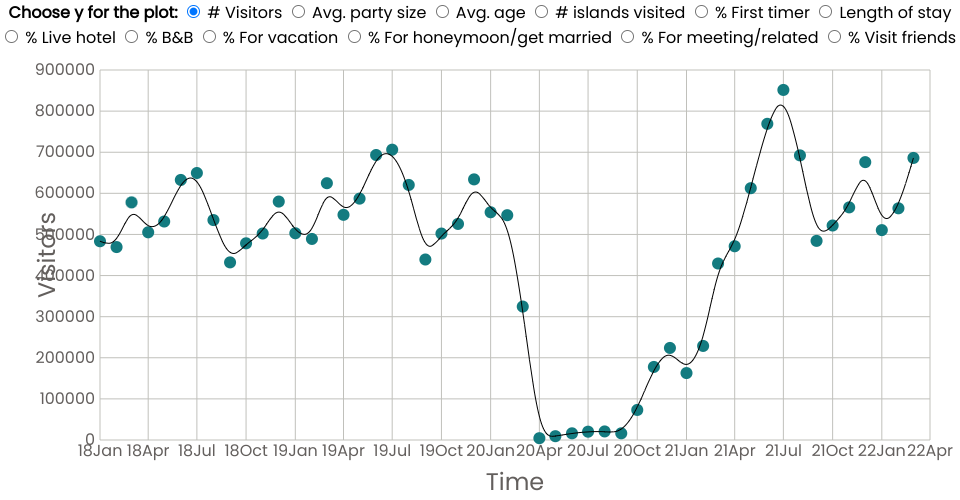 This is the interactive section of the GR 5293 project. The plots present the time series data from Jan. 2018 to March 2022 about Hawaii's monthly visitor number, average party size, or other options shown on the top. Users can click on different buttons to receive different time series plots. We believe this interactive plot is a good supplement to our third question reasearching on the impact of the pandemic and the trends or seasonalities related to time.