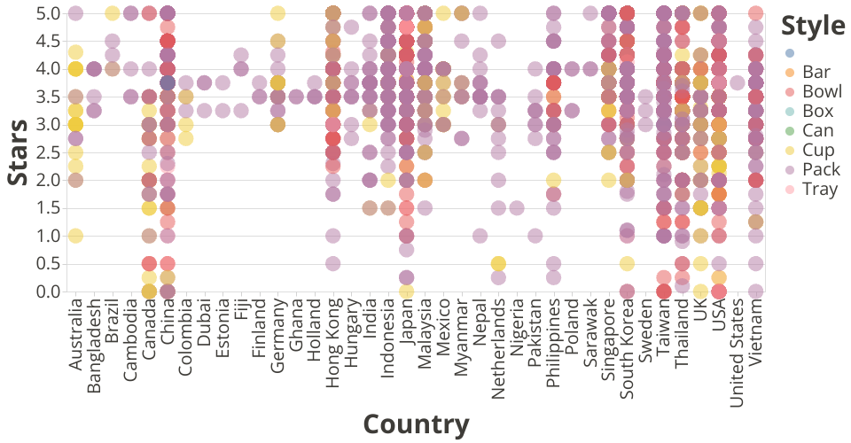 This visualization shows The Ramen Dataset. It's designed to show stars distribution against country. Different color shows different ramen styles.